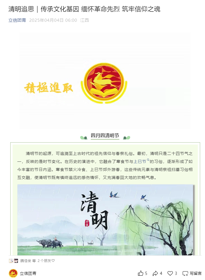 清明节期间,管理学院打造宣传矩阵,线上通过立信团青微信公众号发布《清明追思|传承文化基因缅怀革命先烈筑牢信仰之魂》推文,科普清明节起源、习俗,分享祭扫注意事项;线下组织学生创作清明节主题黑板报,从清明时节祭扫祖先、寄托哀思的场景,到“清明时节雨纷纷,路上行人欲断魂”的千古名句,再到介子推与寒食节的历史典故,丰富的内容让黑板报兼具文化性与趣味性,营造清明节日浓厚氛围。