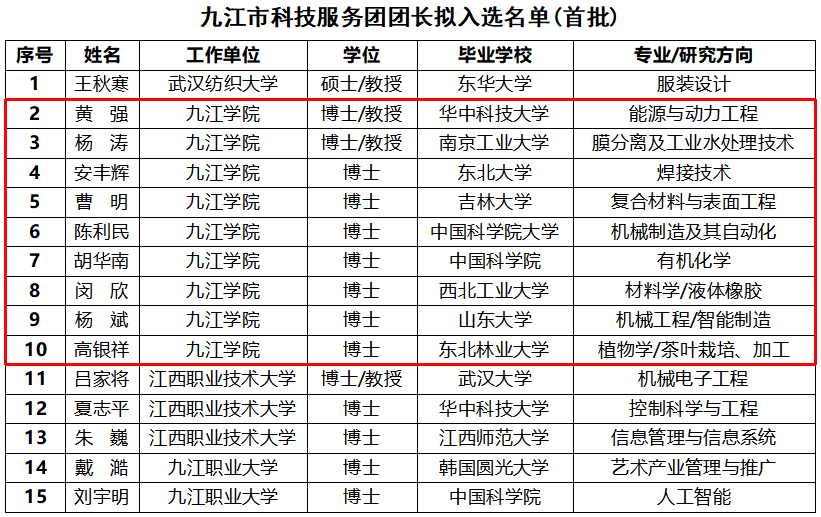 九江市科技服务团卓越行动由市委人才办支持政策和经费,市科协牵头实施,我校创新创业学院和市发明学会具体推进,旨在以我市制造业“9610”工程为重点,将乡村振兴、农旅融合纳入扩大了服务范围,以工博士为主体,将理、农、医等领域博士吸纳充实了人才队伍,实现“队伍扩充、对象扩能、服务扩容、成效扩展”,充分利用驻市高校本土博士人才,引入省外高校高端人才资源,组建校企联合创新团队,全面升级打造九江市科技博士服务团卓越行动。卓越行动包括制定卓越计划、组建卓越团队、推进卓越实践和追求卓越价值四部曲,从2025年起到2027年分三批进行,重点围绕我市制造业“9610”工程,每年(批)遴选组建15个服务团,共45个科技服务团结对帮扶45家重点企业,开展技术攻关、成果转化、人才培养,助力企业产业转型升级,从而促进九江市重点产业链创新发展。