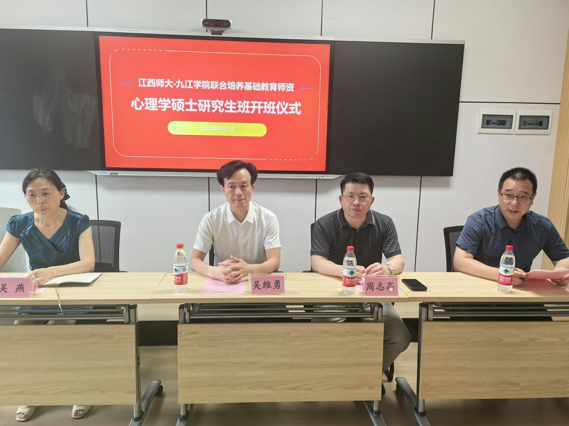 8月2日上午,江西师范大学与九江学院联合培养基础教育师资心理学硕士研究生班开班仪式在九江学院竞知楼209智慧教室举行。校党委委员、副校长吴维勇出席仪式并讲话,发展规划与研究生处、教育学院负责人,全体授课教师,班主任以及首届联合培养班全体学员齐聚一堂,共同见证这一时刻。