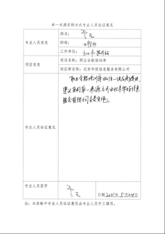 采用单一来源采购方式的原因及说明:本项目“职业全能培训库”是由北京华炬信息服务有限公司自主研发,为此该软件只能由北京华炬信息服务有限公司提供,建议采用单一来源采购方式,由北京华炬信息服务有限公司具体实施。