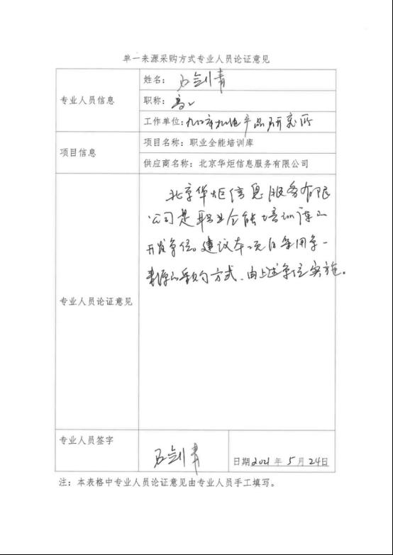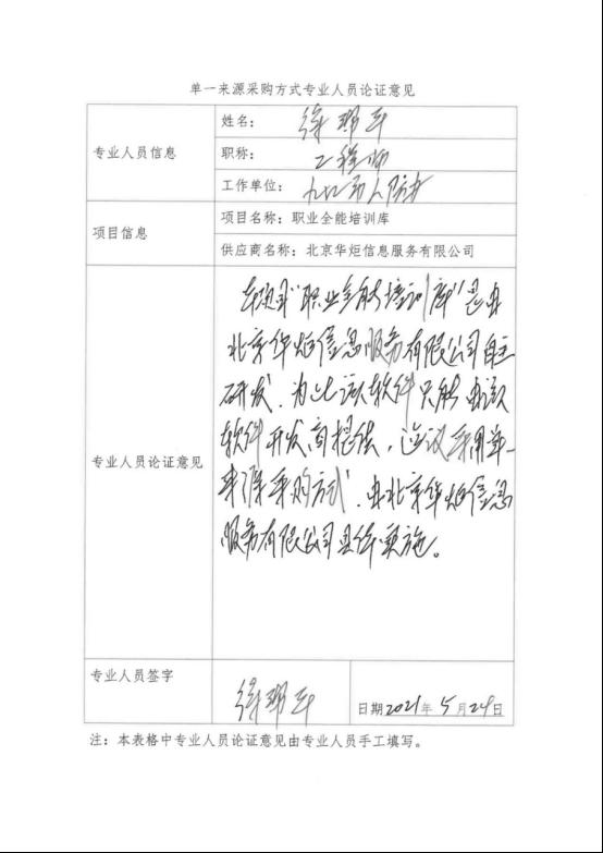 本项目“职业全能培训库”是由北京华炬信息服务有限公司自主研发,为此该软件只能由北京华炬信息服务有限公司提供,建议采用单一来源采购方式,由北京华炬信息服务有限公司具体实施。